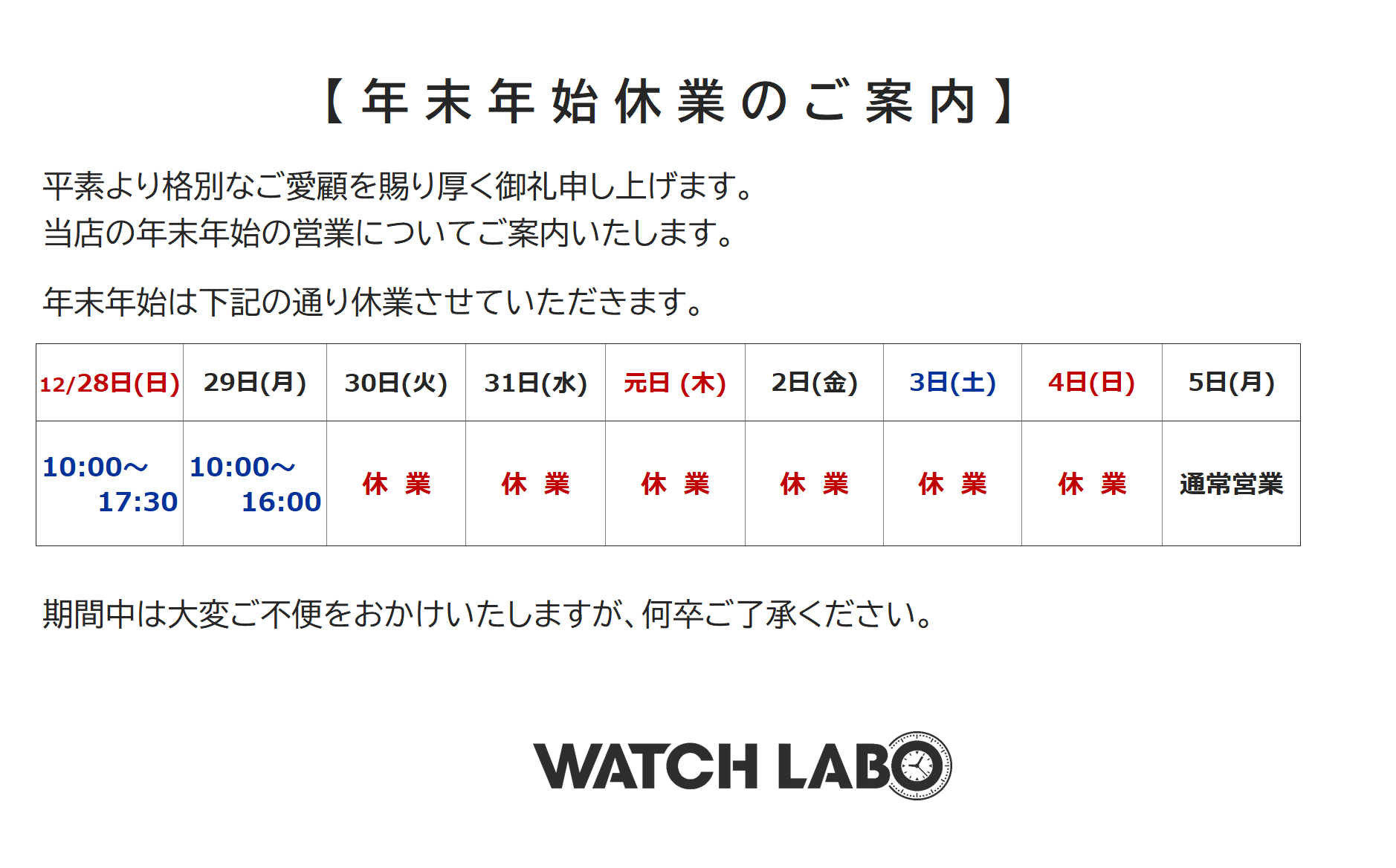 01Dec2025 【2025-2026年】 年末年始 休業のご案内 定休日 変更のご案内 最近のお知らせ一覧お知らせ一覧 定休日 変更のご案内 2025.09.24 2025年 夏季休業のご案内 2025.07.29 2025年6月1日 料金を改定いたしました。 2025.05.31 5月28日(水) 臨時休業のお知らせ 2025.05.27 【2025年ゴールデンウイーク】営業時間・休業日のご案内 2025.04.14