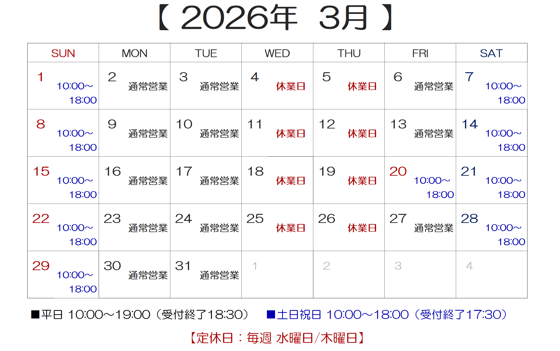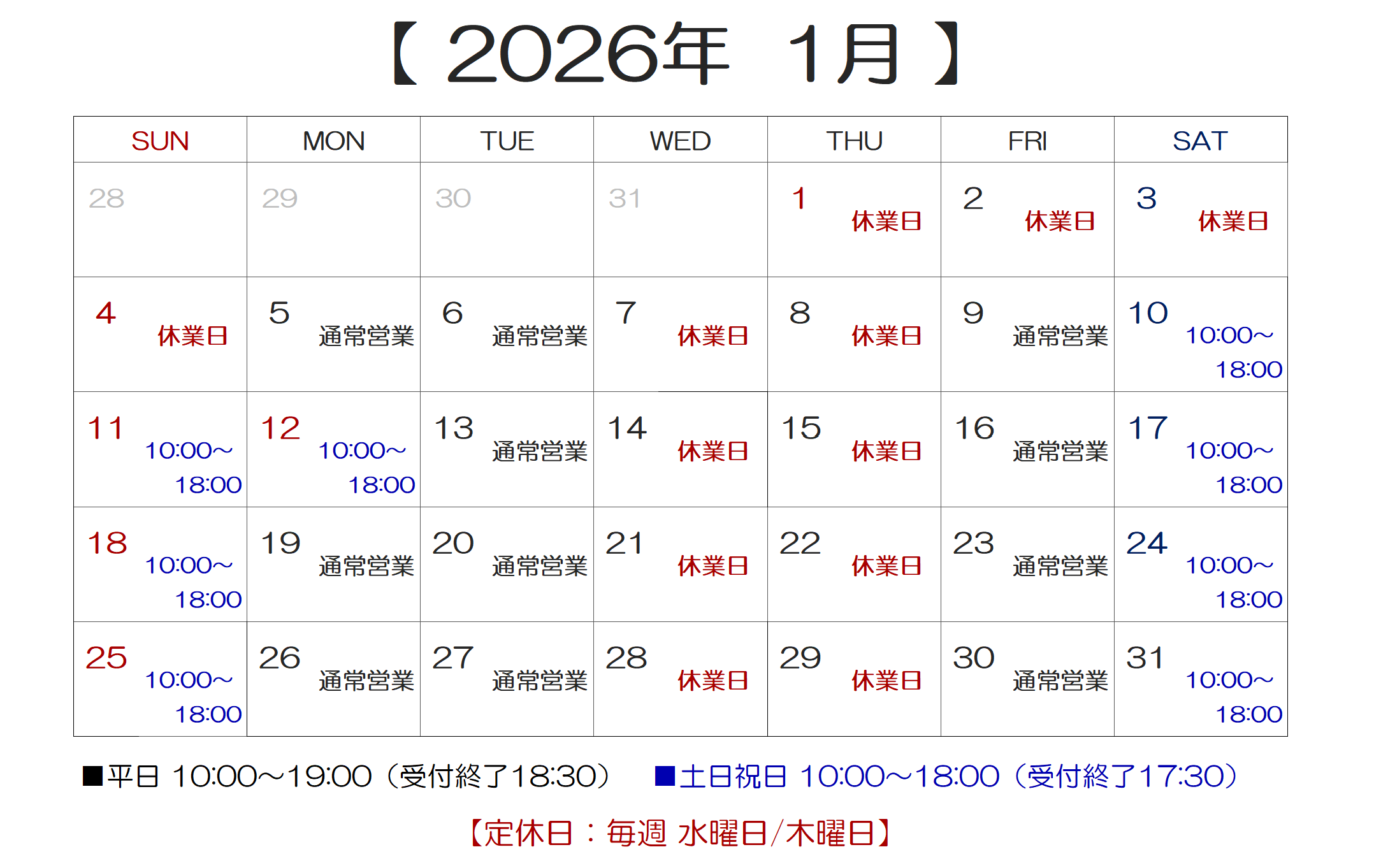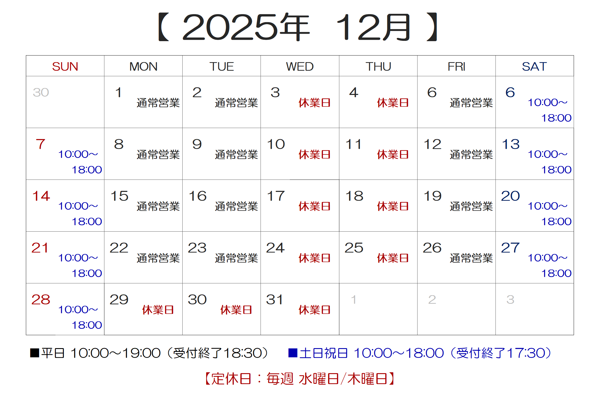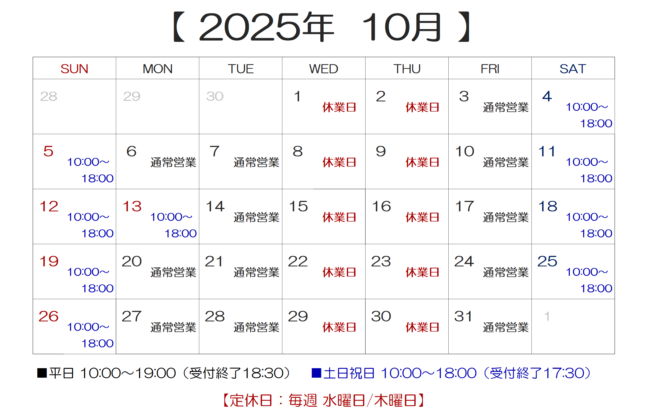 最新情報は下記のカレンダーでご確認下さい。 【営業時間のご案内】 ■平日:10:00~19:00(受付終了 18:30) ■土日祝日:10:00~18:00(受付終了 17:30) ※受付終了時間で閉店させていただく場合がございます。 ※受付終了時間以降に修理品のお引取りでご来店いただく場合は、事前にご予約が必要となります。 【休業日のご案内】 ■休業日:毎週 水曜日・木曜日 ※休業日以外に臨時休業させていただく場合がございます。 【 定休日変更のご案内 】 隔週で営業しておりました水曜日は 2025年10月より休業日とさせていただきます。 今後は毎週 水曜日と木曜日が定休日になります。 大変ご不便をおかけいたしますが、何卒ご了承をお願いいたします。 s